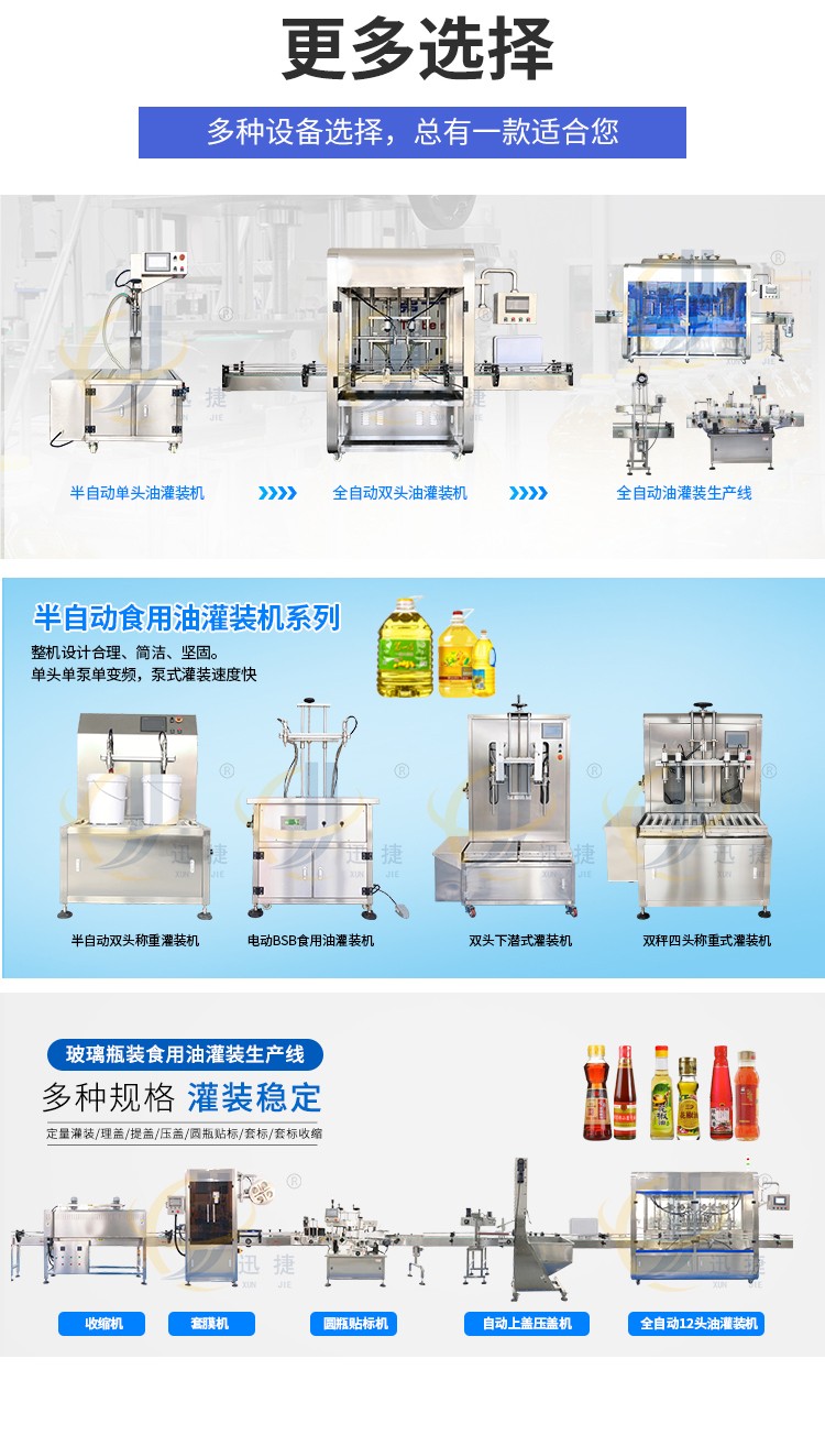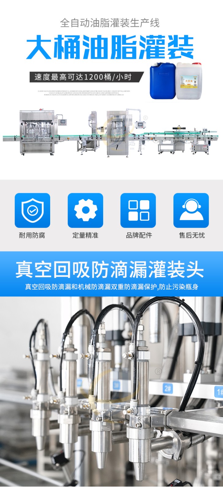 全自動(dòng)油脂灌裝生產(chǎn)線適用于灌裝各種油類及粘稠液體,如花生油、調(diào)和油、菜籽油等食用油的灌裝??筛鶕?jù)灌裝需求定制機(jī)型。