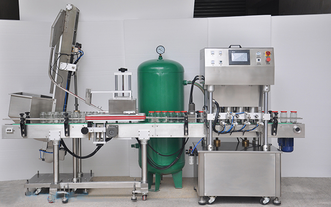 全自動直線式真空旋蓋機采用世界知名工廠電器和氣動元件,故障率低,性能穩定可靠,使用壽命長,主要用于玻璃瓶馬口鐵蓋的灌裝。